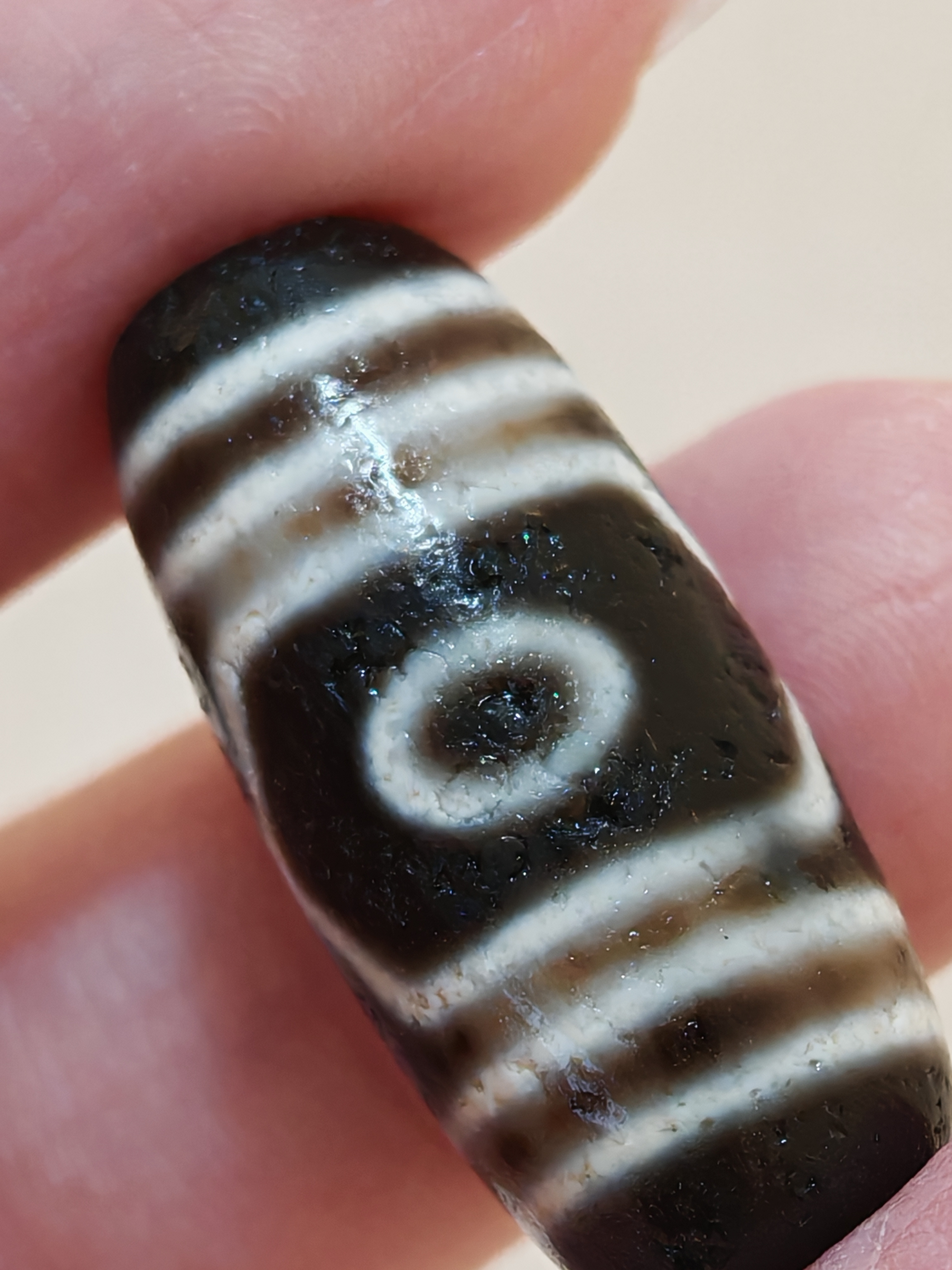 「黑白三眼天珠」25051 尺寸:27*12MM 三眼天珠 1. 象徵長壽、富貴與安康。 2. 招正財、聚財氣,助事業發展。 3. 增強溝通力,化解人際阻礙。 4. 代表佛家「佛法僧」三寶,提升覺察力。 適合人群 1. 創業者:強化財運與決策力。 2. 職場工作者:改善人際,避開小人。 3. 求健康長壽者:護佑身心平衡。 4. 修行者:助益禪定與智慧增長。